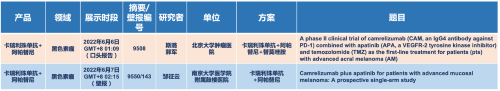 在黑色素瘤领域,AG旗舰厅医药的卡瑞利珠单抗联合阿帕替尼(“双艾”组合)在2022 ASCO共入选1项口头报告和1项壁报展示。