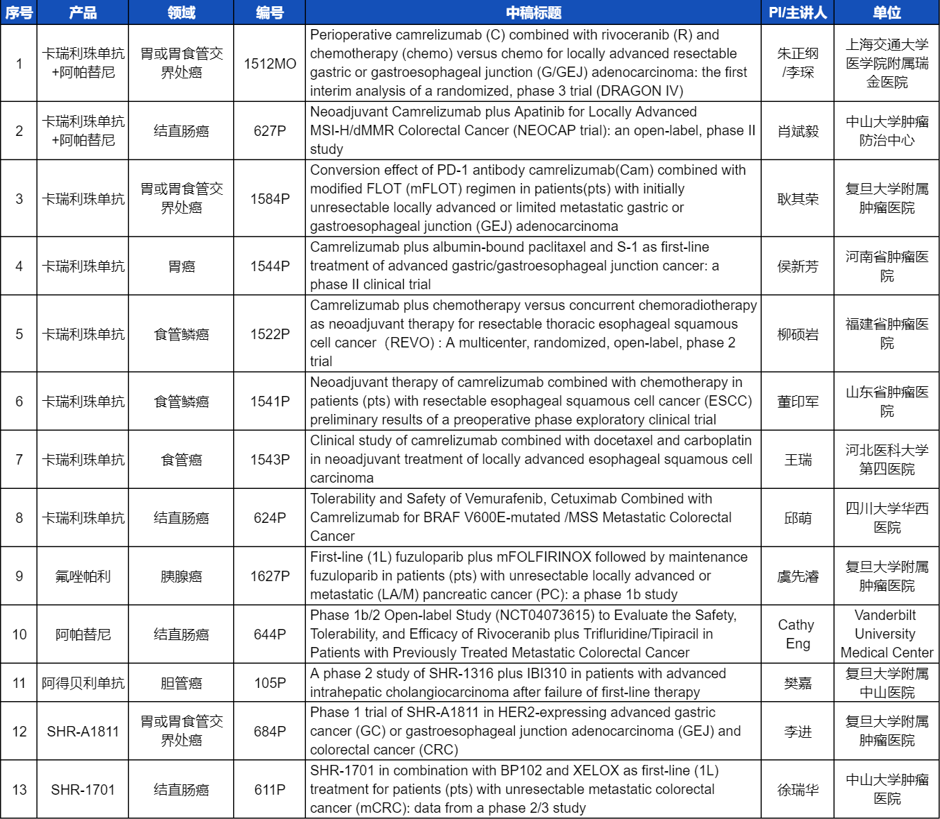 在消化系统肿瘤领域,AG旗舰厅创新产品相关研究共入选1项口头报告和12项壁报展示。除了经典的明星药物卡瑞利珠单抗和阿帕替尼,SHR-A1811、SHR-1701等未上市创新产品也有相应研究入选。此外,阿得贝利单抗、氟唑帕利等已上市药物也在积极探索新的适应症,本次ESMO大会分别有肝内胆管癌和胰腺癌相关研究入选。这些新老药物前沿研究的不断出现,有望为消化系统肿瘤患者带来新的福音!