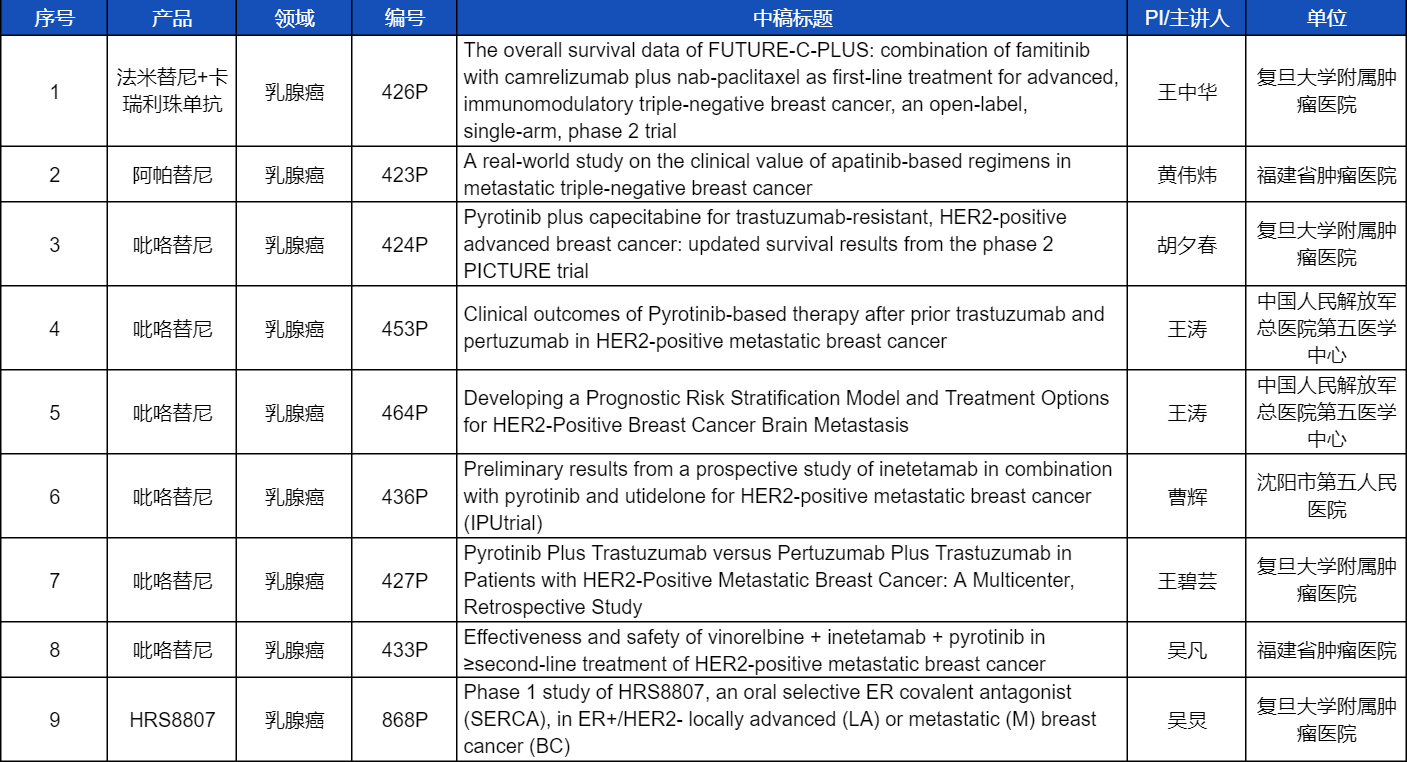 12款抗肿瘤创新药包括6款已上市产品:注射用卡瑞利珠单抗(艾瑞卡®)、甲磺酸阿帕替尼片(艾坦®)、马来酸吡咯替尼片(艾瑞妮®)、阿得贝利单抗注射液(艾瑞利®)、氟唑帕利胶囊(艾瑞颐®)、瑞维鲁胺片(艾瑞恩®),以及6款未上市产品:多靶点受体酪氨酸激酶抑制剂法米替尼、抗PD-L1/TGF-βRII双抗SHR-1701、组蛋白甲基转移酶EZH2抑制剂SHR2554、HER2抗体偶联药物(ADC)SHR-A1811、HER3抗体偶联药物SHR-A2009、新型选择性雌激素受体共价拮抗剂(SERCA)HRS8807等。此次ESMO大会的最新突破摘要(LBA)结果尚未披露,敬请期待!本文特对33项研究成果做了梳理,带领各位读者领略AG旗舰厅医药创新之光。