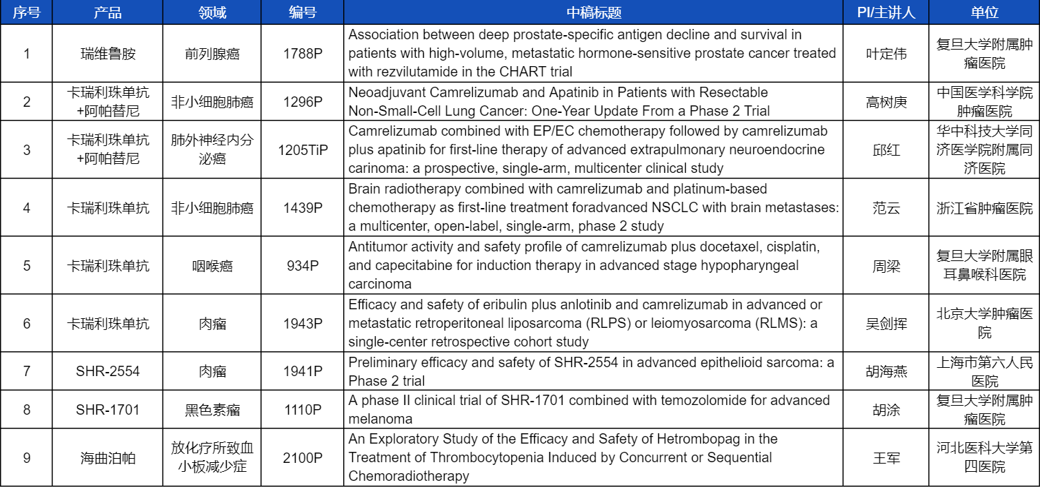 在非小细胞肺癌、咽喉癌、肉瘤、前列腺癌、黑色素瘤等多个领域,卡瑞利珠单抗、阿帕替尼、瑞维鲁胺、SHR-1701、SHR2554等创新产品相关研究一共入选了8项壁报展示。此外,AG旗舰厅医药自主研发的血小板生成素受体激动剂(TPO-RA)海曲泊帕在放化疗所致血小板减少领域的探索性研究显示良好的疗效,入选壁报展示。