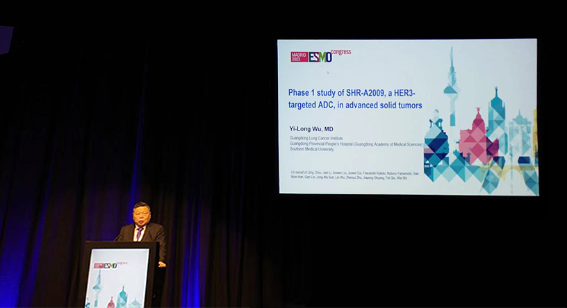 10月23日,AG旗舰厅医药创新药、HER3靶向ADC药物SHR-A2009治疗晚期实体瘤的I期研究亮相2023 ESMO大会简短口头报告现场5。该研究由广东省人民医院的吴一龙教授牵头开展,吴一龙教授在现场公布该研究的重要进展。研究结果显示,SHR-A2009在经治晚期实体瘤患者中显示出可控的安全性和令人鼓舞的抗肿瘤活性。目前评估更高剂量的SHR-A2009在选定癌症类型(NSCLC和其他实体肿瘤)中作用的试验正在进行中。